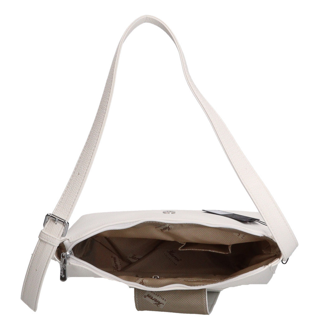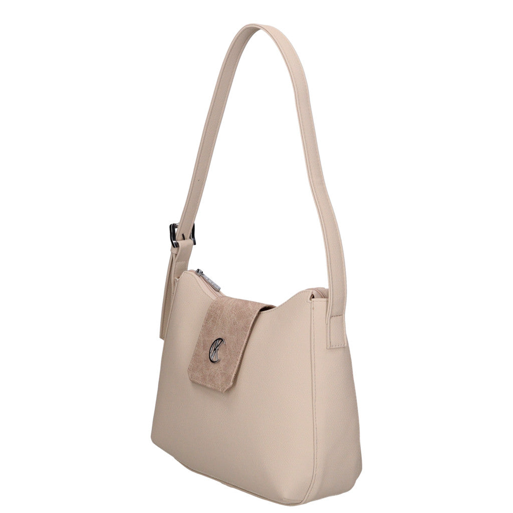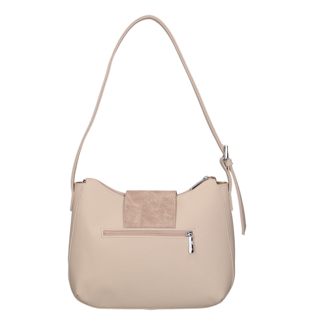 A táska elején csatos áthajtó található, amely stílusos megjelenést ad, hátul pedig külön cipzáras zseb segíti a gyorsan elérhető apróságok tárolását. A belső tér egyterű, komfortos elrendezésű, mobiltokkal és belső zsebbel, így minden fontos dolog könnyen rendszerezhető. Az alján elhelyezett fém védőtalpak növelik a tartósságot és megóvják a táskát a kopástól.